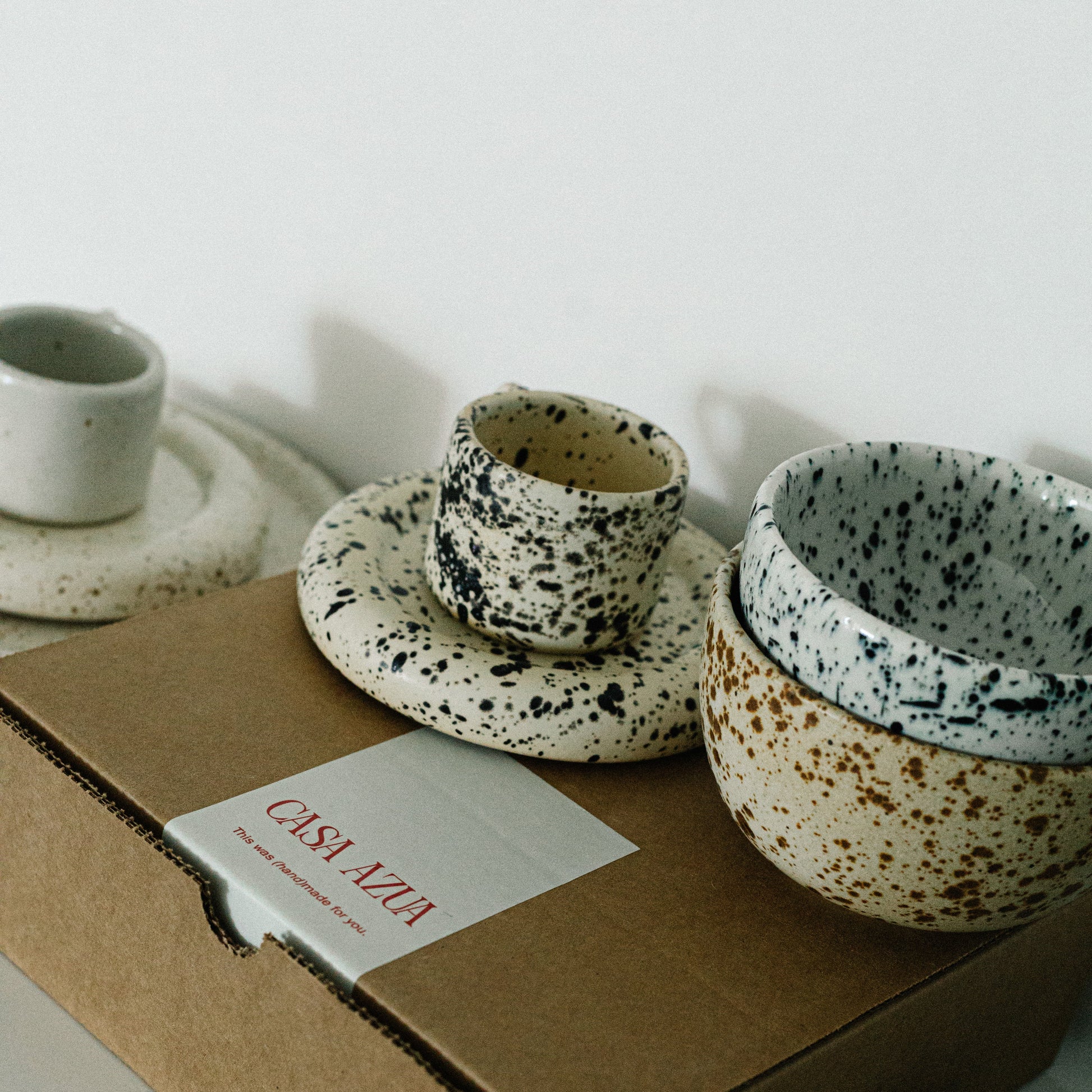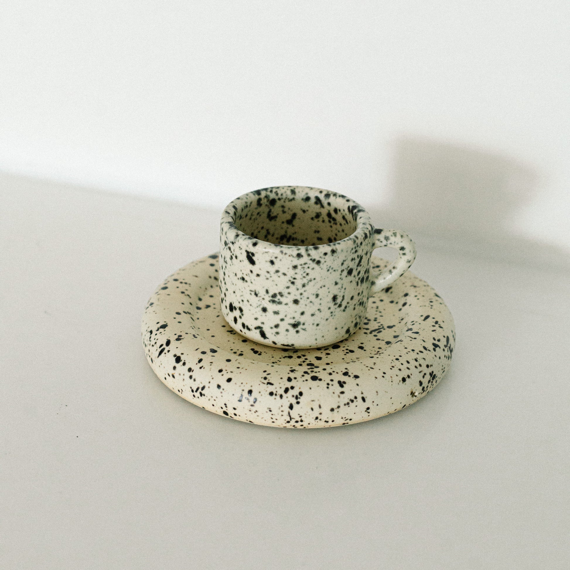 - Beige with black speckles mug and matching saucer. Matte finish.