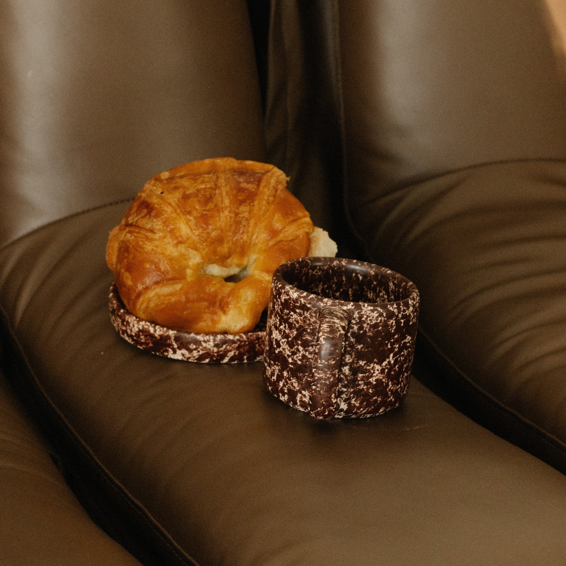 A statement mug in deep burgundy, modern, chic, and subtle. Designed to make the everyday feel like a special occasion. Handmade ceramic mug with handle, burgundy speckled over a white background with a matte finish.