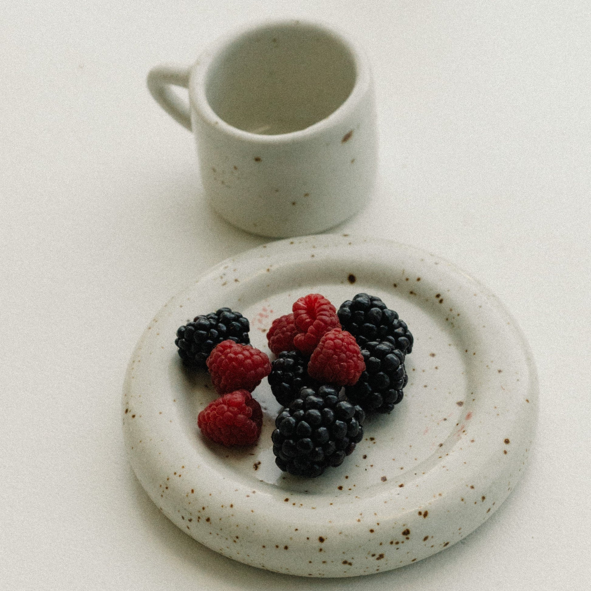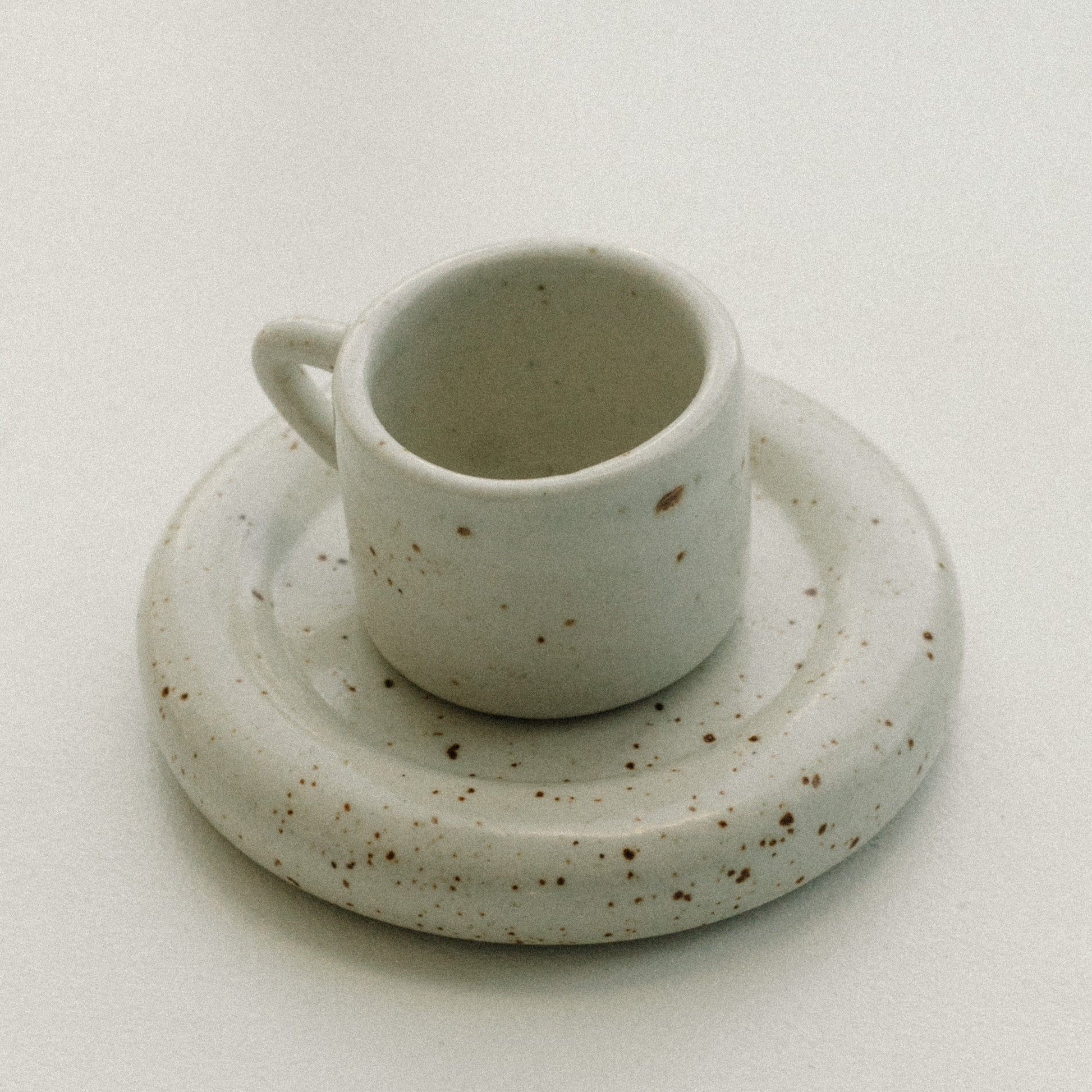 - Off-White with light brown speckles mug and matching saucer. Glossy finish.