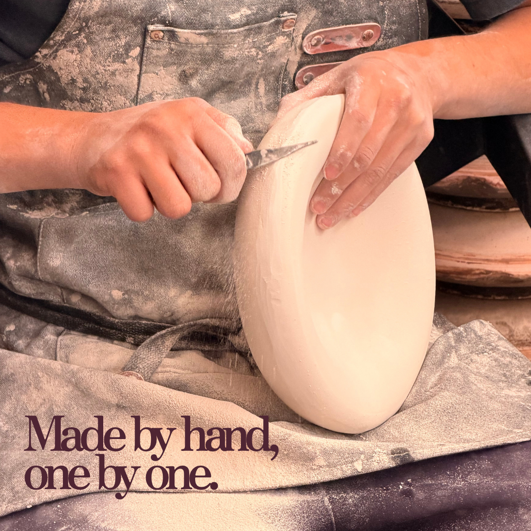 Variations in texture, color, and shape are inherent to the handmade process. Each piece is made entirely by hand, no two are exactly alike.